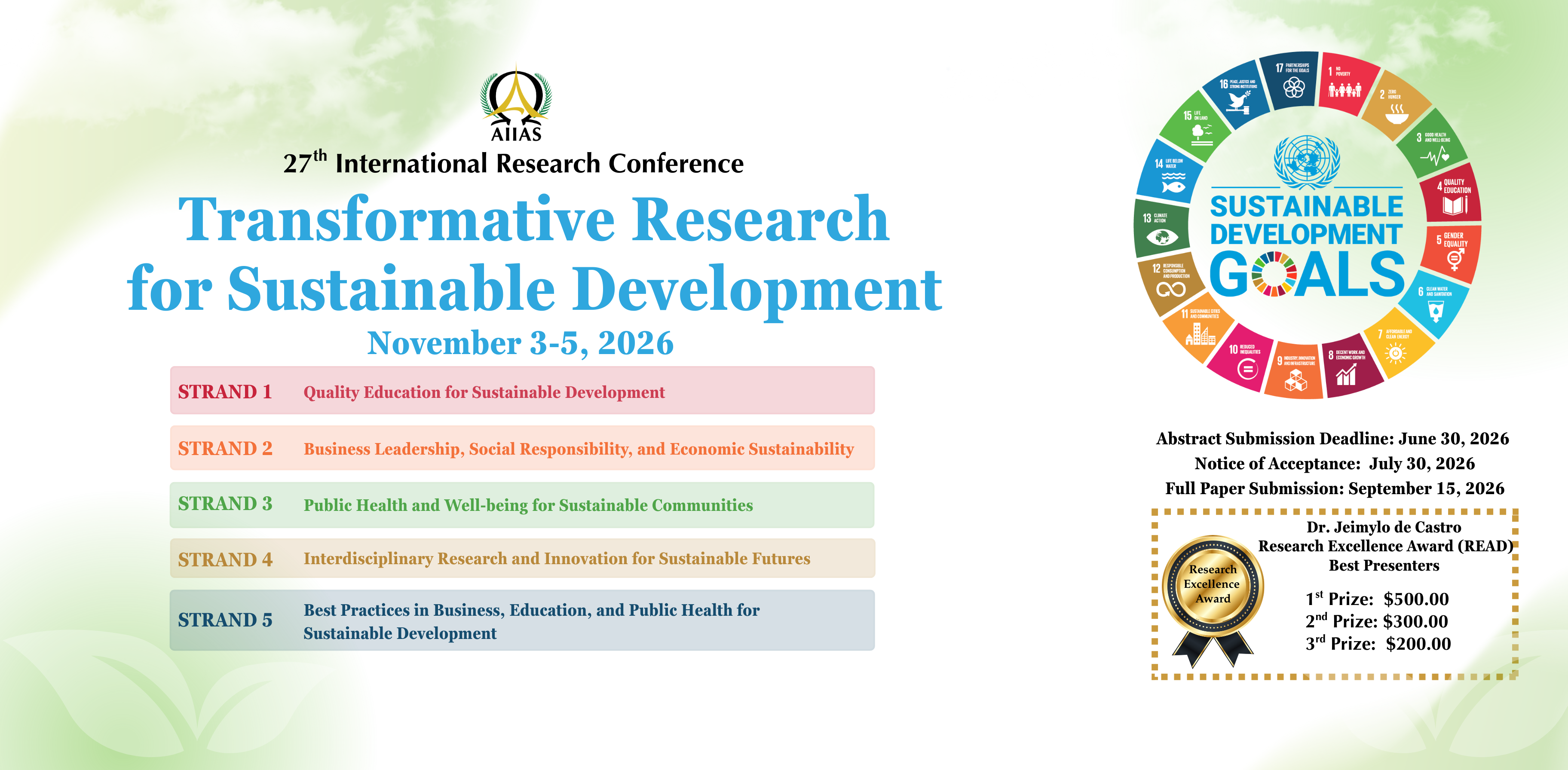 The 27th International Research Conference (IRC) is committed to advancing sustainable development through innovative, evidence-based, contextually relevant, and transformative research that support human well-being, economic resilience, social equity, and environmental integrity.